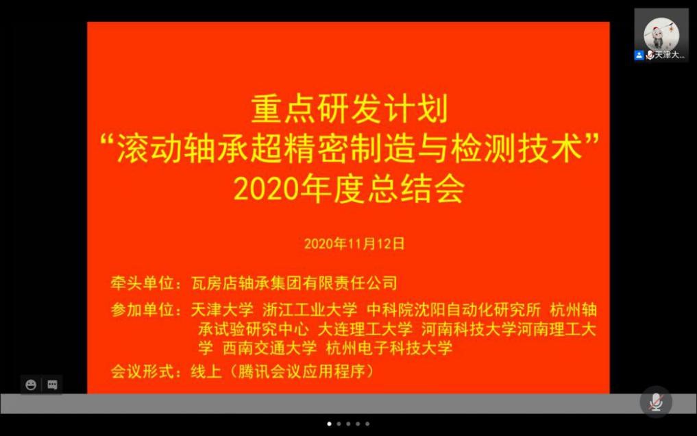 本站訊(通訊員 何春雷)2020年11月12日上午,由瓦房店軸承集團有限公司作為牽頭單位的國家重點研發(fā)計劃“制造基礎(chǔ)技術(shù)與關(guān)鍵部件”重點專項項目“滾動軸承超精密制造與檢測技術(shù)”2019-2020年度匯報會議于線上線下同時召開。來自天津大學(xué)、浙江工業(yè)大學(xué)、中科院沈陽自動化研究所、杭州軸承試驗研究中心、大連理工大學(xué)、河南科技大學(xué)、河南理工大學(xué)、西南交通大學(xué)、杭州電子科技大學(xué)的專家和學(xué)者參與會議。會議由項目負責(zé)人天津大學(xué)機械工程學(xué)院任成祖教授主持。