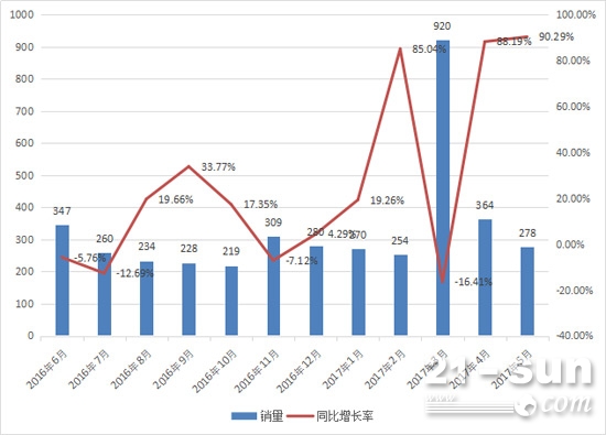 2017年5月,納入統(tǒng)計的10家主要推土機生產(chǎn)企業(yè)共銷售各類型推土機529臺,同比大增90.29%,連續(xù)兩個月、今年以來第三次,同比增幅超8成。