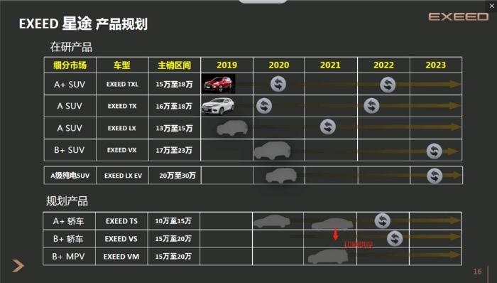 2019年5月exeed星途品牌公布了其到2023年的新車產(chǎn)品規(guī)劃,除了已經(jīng)發(fā)布的產(chǎn)品外,在規(guī)劃產(chǎn)品中還有兩款轎車和一款mpv車型。近期從官方渠道獲悉,2021年內(nèi)星途將發(fā)布此前已規(guī)劃的一款轎車和一款mpv車型,分別為定位于中型轎車的星途vs和中大型mpv的星途vm,主銷價格均介于15-20萬之間。