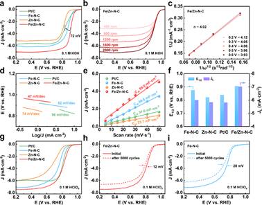李犁教授團(tuán)隊(duì)隨后發(fā)現(xiàn)fe/zn-n-c獨(dú)特的半金屬電子結(jié)構(gòu)使催化劑在0.1 m koh和0.1 m hclo4中均表現(xiàn)出優(yōu)異的電催化活性,其中半波電位分別為0.906 v和0.808 v,超過(guò)了pt/c以及大多數(shù)最先進(jìn)的電催化劑。此外,該材料還表現(xiàn)出在實(shí)際應(yīng)用中苛刻酸性條件下的高長(zhǎng)期耐久性,5000次電位循環(huán)后僅有12 mv的電位損耗(圖3)。本工作為通過(guò)電子結(jié)構(gòu)調(diào)節(jié)實(shí)現(xiàn)orr催化劑的高穩(wěn)定性和高活性提供了一種策略,為設(shè)計(jì)高性能的能源電催化劑提供了新的思路。
