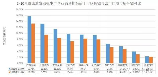 另外,2019年1-10月汽車柴油發(fā)動機生產(chǎn)企業(yè)銷量排名前十企業(yè)市場份額與去年同期市場份額都實現(xiàn)來增長。