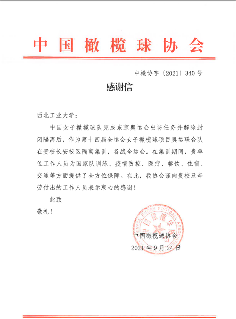 西工大獲中國橄欖球協(xié)會2021年度特別感謝單位獎