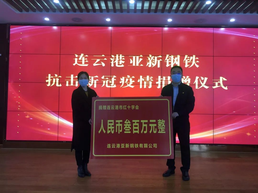 疫情就是命令,防控就是責(zé)任。3月14日,連云港亞新鋼鐵有限公司向連云港市紅十字會(huì)捐款300萬(wàn)元,用于市、縣疫情防控工作。