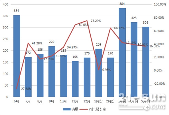 2017年5月份,11家納入統(tǒng)計的平地機生產(chǎn)企業(yè)累計銷售平地機414臺,相比去年同期的303臺,增長36.63%。其中,國內(nèi)銷量為197臺,同比增長55.12%。