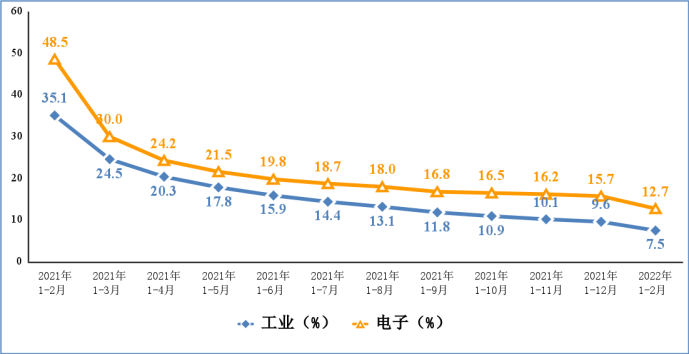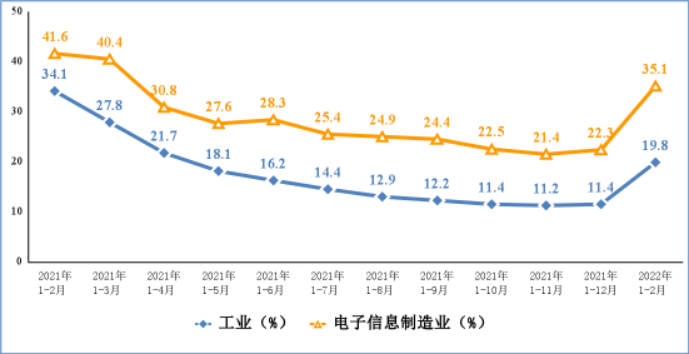 1-2月份,全國規(guī)模以上電子信息制造業(yè)增加值同比增長12.7%,比2020年和2021年兩年平均增速高1.1個百分點(diǎn);比同期工業(yè)增加值增速高5.2個百分點(diǎn),但比高技術(shù)制造業(yè)增加值增速低1.7個百分點(diǎn)。