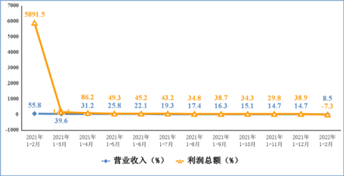 圖3 2021年1-2月份以來電子信息制造業(yè)營業(yè)收入、利潤總額累計(jì)增速