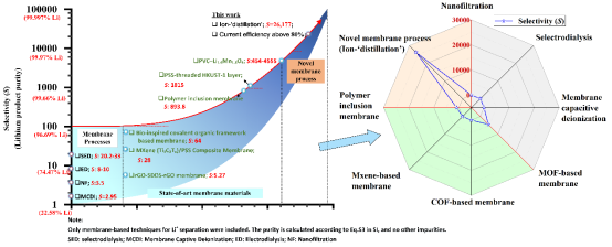 圖3 離子精餾技術(shù)與傳統(tǒng)膜分離技術(shù)及先進(jìn)功能膜材料的先進(jìn)性對(duì)比