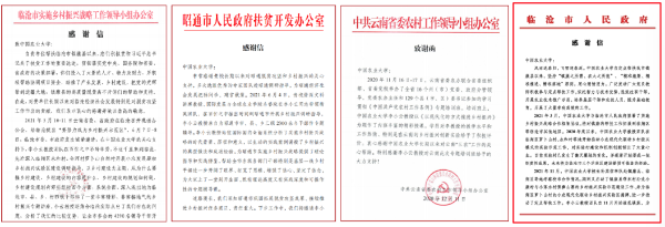 國家鄉(xiāng)村振興局、中共云南省委農(nóng)村工作領(lǐng)導(dǎo)小組辦公室、云南省臨滄市人民政府、中共鎮(zhèn)康縣委、縣政府、昭通市人民政府、防城港市人民政府駐北京聯(lián)絡(luò)處、中共昌都市委員會(huì)統(tǒng)戰(zhàn)部、日喀則市農(nóng)業(yè)農(nóng)村局、四川省農(nóng)業(yè)農(nóng)村廳、重慶市鄉(xiāng)村振興局等來函感謝學(xué)校為脫貧攻堅(jiān)及鄉(xiāng)村振興所做的貢獻(xiàn)。