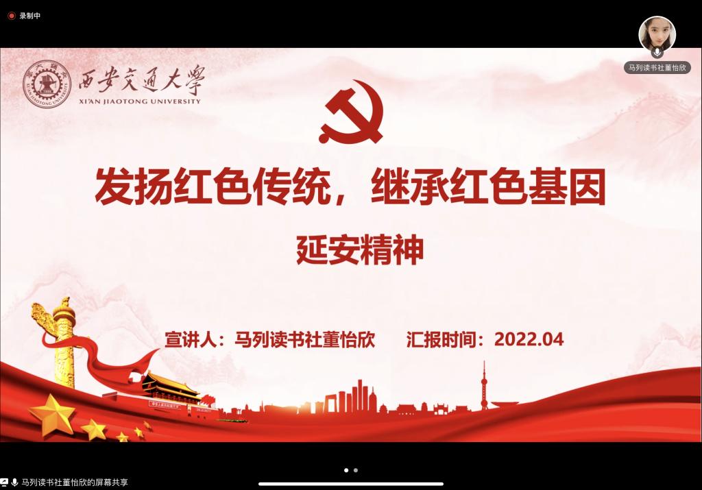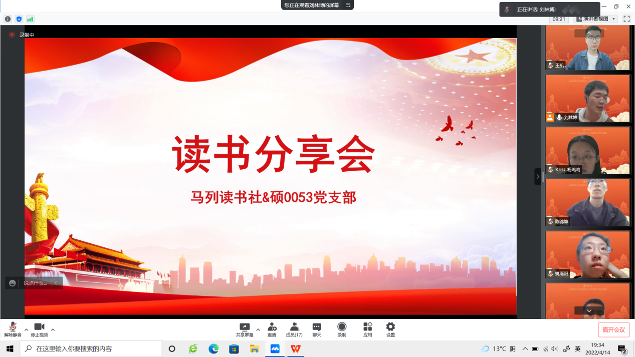 黨性是共產(chǎn)黨員立身、立業(yè)、立德的基石。加強(qiáng)黨性修養(yǎng)對(duì)于每一個(gè)黨員來(lái)說(shuō),都是必須解決好的重大課題。為重溫紅色歷史,培育紅色情懷,進(jìn)一步推動(dòng)支部黨史學(xué)習(xí)教育常態(tài)化,4月14日晚,馬列讀書社成員與電氣工程學(xué)院碩0053黨支部通過(guò)線上形式聯(lián)合舉辦紅色經(jīng)典讀書分享活動(dòng)。電氣工程學(xué)院碩0053黨支部副書記劉林博主持本次分享會(huì)。