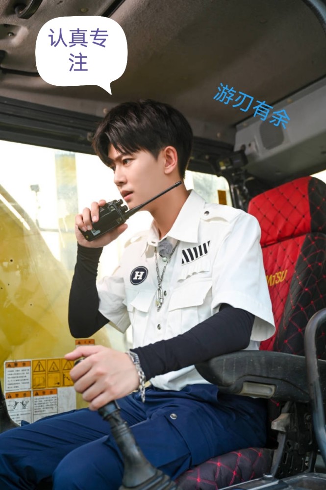 照片中,任嘉倫一身休閑裝,坐在挖掘機(jī)上,右手拿對(duì)講機(jī),左手握掛檔器,認(rèn)真專注的樣子,就像個(gè)職業(yè)人員,游刃有余的完成每個(gè)動(dòng)作。