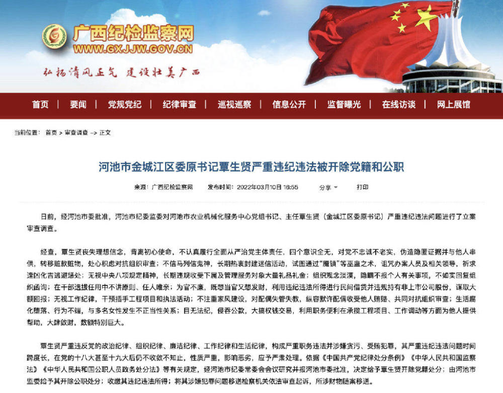 覃生賢嚴重違反黨的政治紀律、組織紀律、廉潔紀律、工作紀律和生活紀律,構(gòu)成嚴重職務違法并涉嫌貪污、受賄犯罪,其嚴重違紀違法問題時間跨度長,在黨的十八大甚至十九大后仍不收斂不知止,性質(zhì)嚴重,影響惡劣,應予嚴肅處理。依據(jù)《中國共產(chǎn)黨紀律處分條例》《中華人民共和國監(jiān)察法》《中華人民共和國公職人員政務處分法》等有關(guān)規(guī)定,經(jīng)河池市紀委常委會會議研究并報河池市委批準,決定給予覃生賢開除黨籍處分;由河池市監(jiān)委給予其開除公職處分;收繳其違紀違法所得;將其涉嫌犯罪問題移送檢察機關(guān)依法審查起訴,所涉財物隨案移送。