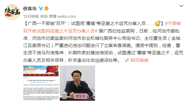 廣西一干部被“雙開”:試圖用“魘鎮(zhèn)”等巫蠱之術(shù)詛咒辦案人員