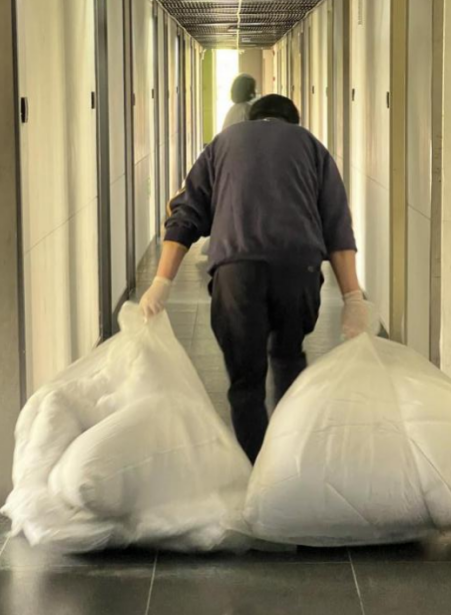 學(xué)生社區(qū)員工響應(yīng)號(hào)召,堅(jiān)守崗位,共克時(shí)艱,全力以赴守護(hù)好學(xué)生社區(qū)的安全防線。彰武路校區(qū)8號(hào)樓內(nèi)有1328名學(xué)生,僅有6名宿管阿姨,工作量成倍增加,人手嚴(yán)重不足,她們每天要運(yùn)送近300包生活垃圾,要對(duì)26層樓進(jìn)行每日7遍的衛(wèi)生消殺。這些阿姨均齡50歲以上,身著大白服的她們每天清晨6點(diǎn)就開(kāi)始了一天的忙碌,清運(yùn)垃圾、衛(wèi)生消殺、搬運(yùn)物資,直到深夜才能卸下一身的疲憊,在臨時(shí)床鋪上休息。面對(duì)重重困難,她們不辭辛苦,把學(xué)生安全放在第一位,連續(xù)40多天日夜堅(jiān)守在疫情防控第一線,保障學(xué)生社區(qū)的安全。