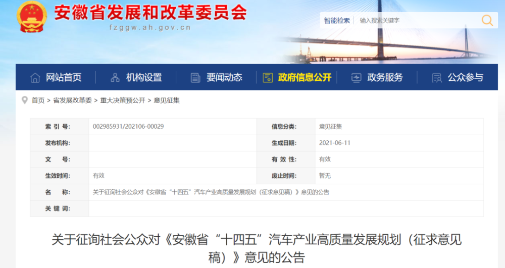 近日,安徽省發(fā)改委發(fā)布關于征詢社會公眾對《安徽省“十四五”汽車產(chǎn)業(yè)高質(zhì)量發(fā)展規(guī)劃(征求意見稿)》意見的公告。