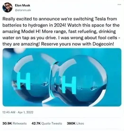 愚人節(jié)這天,馬斯克又搞事了。他在推特上說,經(jīng)過多年的懷疑,他將在2024年將特斯拉從電池轉(zhuǎn)向氫能。