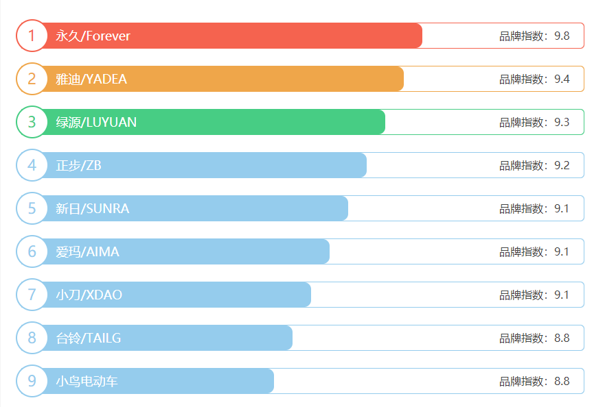 以上就是小行家分享的一份國(guó)產(chǎn)電動(dòng)車(chē)排行榜單的前9名的品牌,從第1到第9依次為:永久、雅迪、綠源、正步、新日、愛(ài)瑪、小刀、臺(tái)鈴、小鳥(niǎo),雖然榜單不能做到完全客觀,但在小行家覺(jué)得,以上這些品牌,基本上是可以稱(chēng)得上國(guó)產(chǎn)的電動(dòng)車(chē)大品牌稱(chēng)號(hào)。