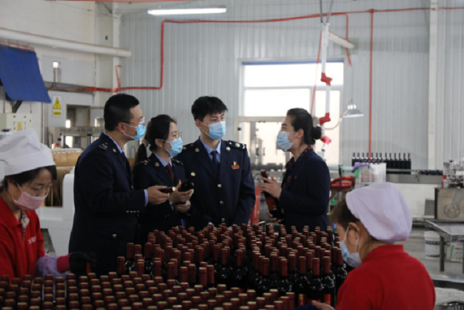 圖為:國家稅務(wù)總局通化市二道江區(qū)稅務(wù)局前往通化萬通葡萄酒股份有限公司生產(chǎn)車間了解生產(chǎn)情況,并將新的組合式稅費支持政策送到企業(yè)手中。