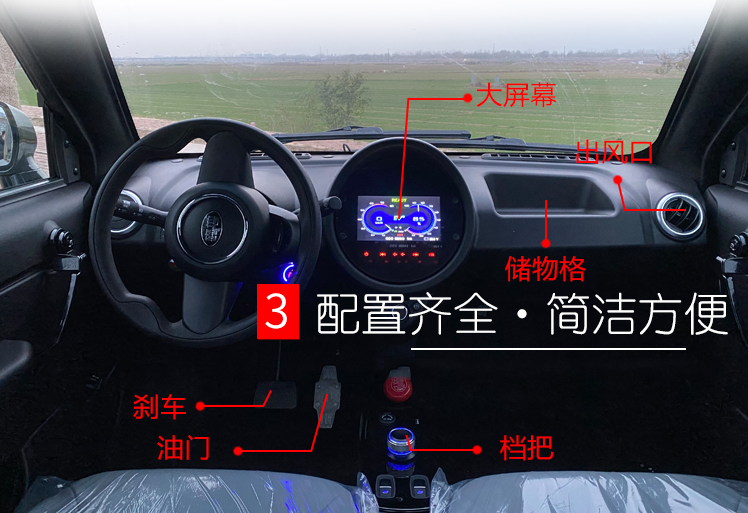 (5)功能配置:這款車的功能配置是老年代步車中比較少見的齊全,車輛搭載了7寸大屏,支持倒車影像、影音娛樂,車輛配置了一鍵啟動、電動調(diào)節(jié)后視鏡、開啟后備箱、升降車窗的智能控制,配備藍(lán)牙音樂,手機(jī)聯(lián)網(wǎng)系統(tǒng),而且,在這些功能配置之外,它還搭載了冷暖空間,非常實用。