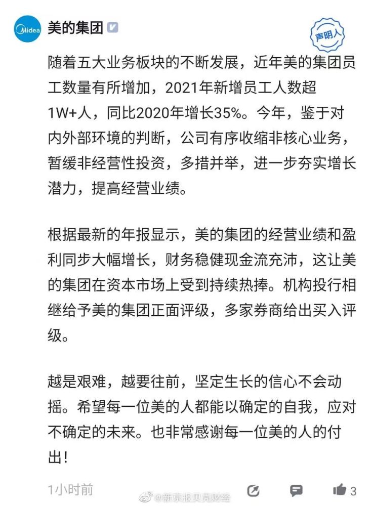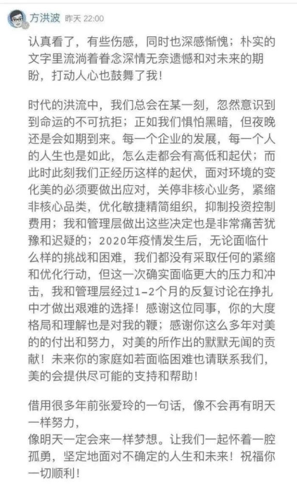隨后,美的集團董事長方洪波在內(nèi)網(wǎng)對一位被裁老員工的留言進行了回應(yīng)。