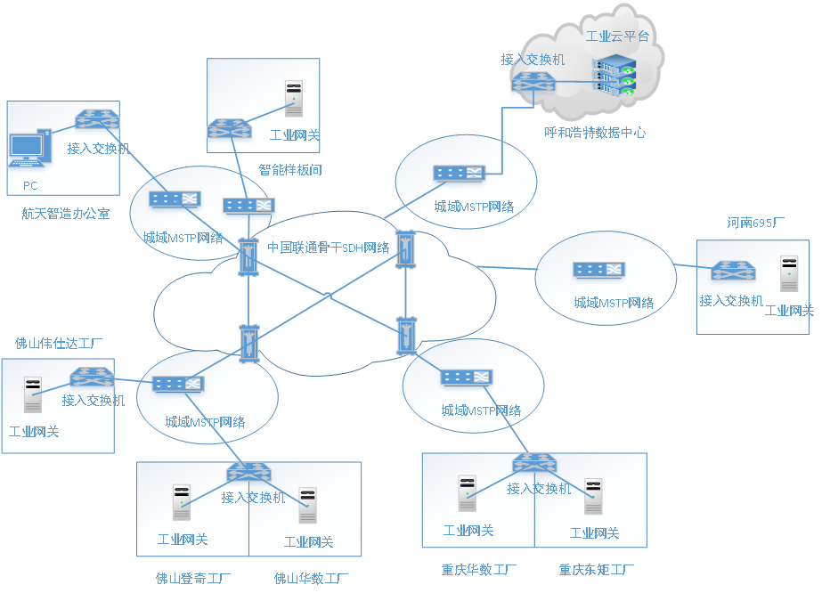搭建一個(gè)基于mstp的單棧ipv6物聯(lián)接入的工業(yè)應(yīng)用驗(yàn)證環(huán)境,在骨干段依托于骨干sdh網(wǎng)絡(luò)進(jìn)行傳輸,各接入段采用mstp設(shè)備進(jìn)行匯聚接入,通過構(gòu)建雙鏈路基礎(chǔ)傳輸網(wǎng)絡(luò),形成安全性、穩(wěn)定性以及可靠性高的廣域以太網(wǎng)專線,覆蓋北京、河南、廣東、四川等多個(gè)省市,實(shí)現(xiàn)工業(yè)數(shù)據(jù)的高效聯(lián)通測試環(huán)境,支持完成智能制造中ipv6應(yīng)用的開發(fā)和驗(yàn)證。