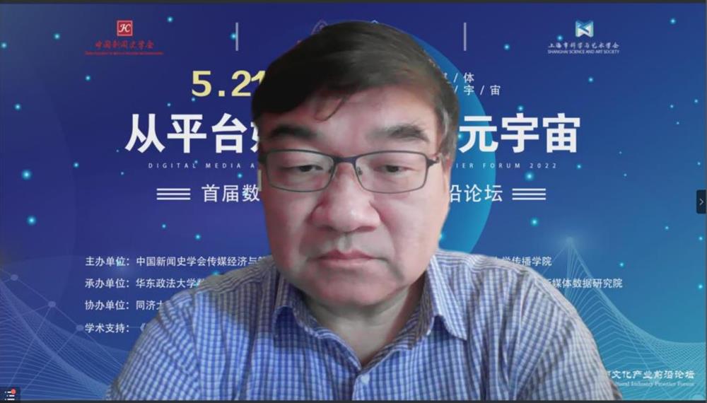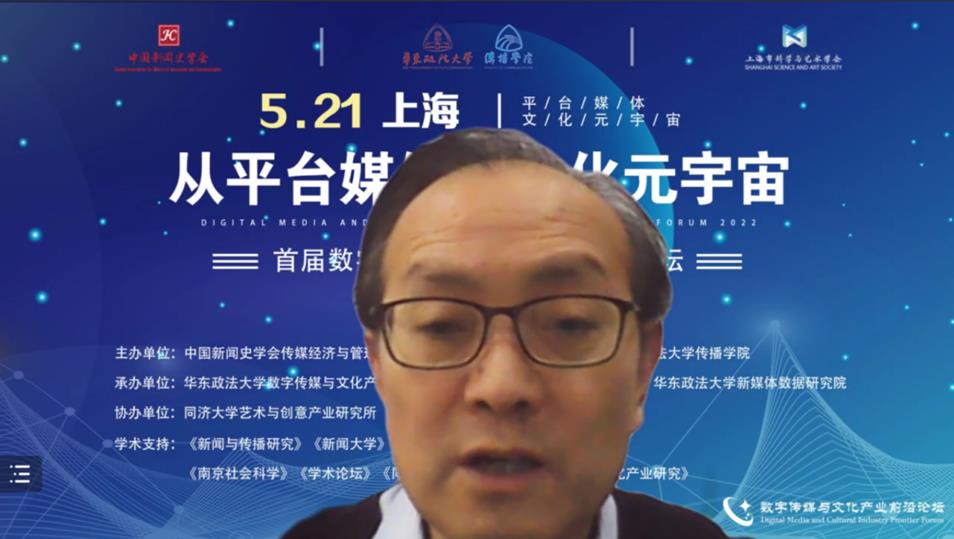 人民網(wǎng)上海5月22日電 (葛俊俊、林文萍、朱斯斯)5月21日,由華東政法大學(xué)傳播學(xué)院聯(lián)合中國新聞史學(xué)會傳媒經(jīng)濟(jì)與管理專委會、上海市科學(xué)與藝術(shù)學(xué)會主辦,以“從平臺媒體到文化元宇宙”為主題的首屆數(shù)字傳媒與文化產(chǎn)業(yè)前沿論壇(以下簡稱“前沿論壇”)在線召開。來自清華、北大、北師大、中國社科院、復(fù)旦、交大等國內(nèi)外60多所高校的專家學(xué)者以及60余位企業(yè)嘉賓就論壇主題進(jìn)行了深入的研討。