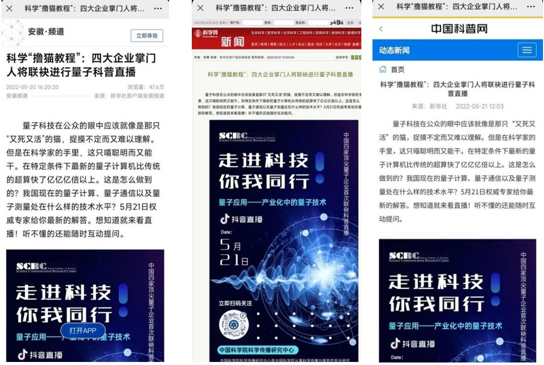 新華社以《科學(xué)“擼貓教程”:四大企業(yè)掌門人將聯(lián)袂進行量子科普直播》為題首發(fā)預(yù)告,科學(xué)網(wǎng)、中國科普網(wǎng)、新華網(wǎng)、今日頭條、搜狐、新浪等主流媒體跟進報道。