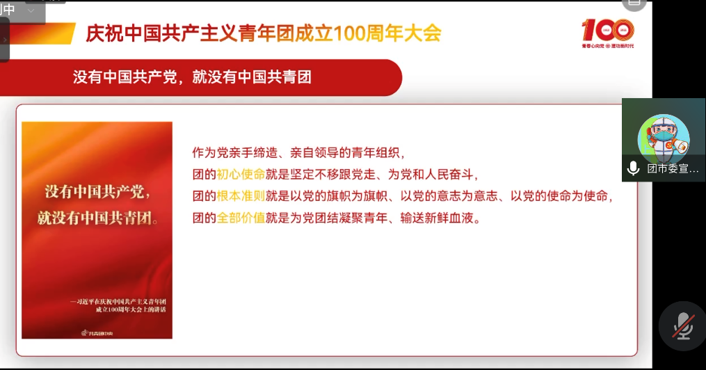 6月14日,同濟(jì)大學(xué)第五屆殷夫班專(zhuān)題培訓(xùn)會(huì)在線舉辦。上海市團(tuán)委宣傳部部長(zhǎng)何婷婷就習(xí)近平總書(shū)記在慶祝中國(guó)共產(chǎn)主義青年團(tuán)成立一百周年大會(huì)上的重要講話(huà)與同學(xué)們進(jìn)行了交流。同濟(jì)大學(xué)青馬工程第五屆殷夫班全體學(xué)員參加了活動(dòng)。