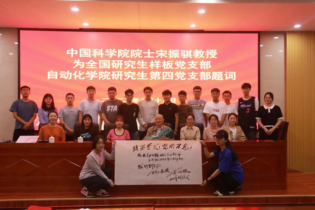 報告會后,宋振騏院士為全國研究生樣板黨支部自動化學院研究生第四黨支部題詞“踔厲奮發(fā),篤行不怠—預(yù)祝自動化學院研究生第四黨支部取得全國研究生樣板黨支部稱號”,并與黨支部全體成員合影留念。