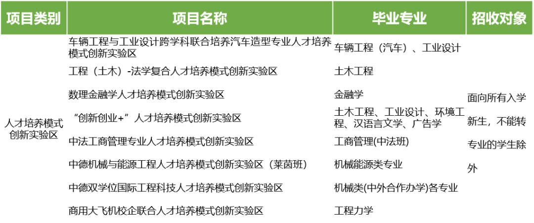 此外,在培養(yǎng)交叉復(fù)合人才方面,同濟(jì)大學(xué)多年來一直設(shè)有人才培養(yǎng)模式創(chuàng)新實(shí)驗(yàn)區(qū),培養(yǎng)國家和社會(huì)需要的復(fù)合型、創(chuàng)新性、國際化人才。實(shí)驗(yàn)區(qū)共有八個(gè)項(xiàng)目,涉及理、工、文、管、經(jīng)濟(jì)等專業(yè),在交叉培養(yǎng)、雙創(chuàng)融合、校企聯(lián)培和對(duì)歐交流方面各具特色。歷年來,這些項(xiàng)目深受廣大學(xué)子的喜愛和贊譽(yù)。今年新生將繼續(xù)有機(jī)會(huì)享受到這一交叉復(fù)合人才培養(yǎng)的優(yōu)質(zhì)資源。除少量不允許轉(zhuǎn)專業(yè)的新生外,全部新生都可基于興趣和自愿原則,參加人才培養(yǎng)模式創(chuàng)新實(shí)驗(yàn)區(qū)的選拔。學(xué)生進(jìn)入實(shí)驗(yàn)區(qū)的項(xiàng)目后,將轉(zhuǎn)入項(xiàng)目相應(yīng)的專業(yè),按照項(xiàng)目培養(yǎng)方案進(jìn)行培養(yǎng)。