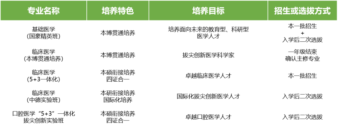 除開展上述兩個(gè)醫(yī)學(xué)招生培養(yǎng)項(xiàng)目外,臨床醫(yī)學(xué)(本博貫通培養(yǎng))在醫(yī)學(xué)試驗(yàn)班中進(jìn)行招生,意在培養(yǎng)拔尖創(chuàng)新型醫(yī)學(xué)科學(xué)家。