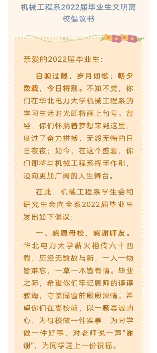 5月15日,機(jī)械工程系學(xué)生會(huì)和研究生會(huì)聯(lián)合發(fā)起以“感恩母校、感謝師友,奉獻(xiàn)愛心、傳遞真情,遵章守紀(jì)、文明有禮,迎接挑戰(zhàn)、開啟征程”為主題的文明離校倡議,得到了全體畢業(yè)生的熱烈響應(yīng)。
