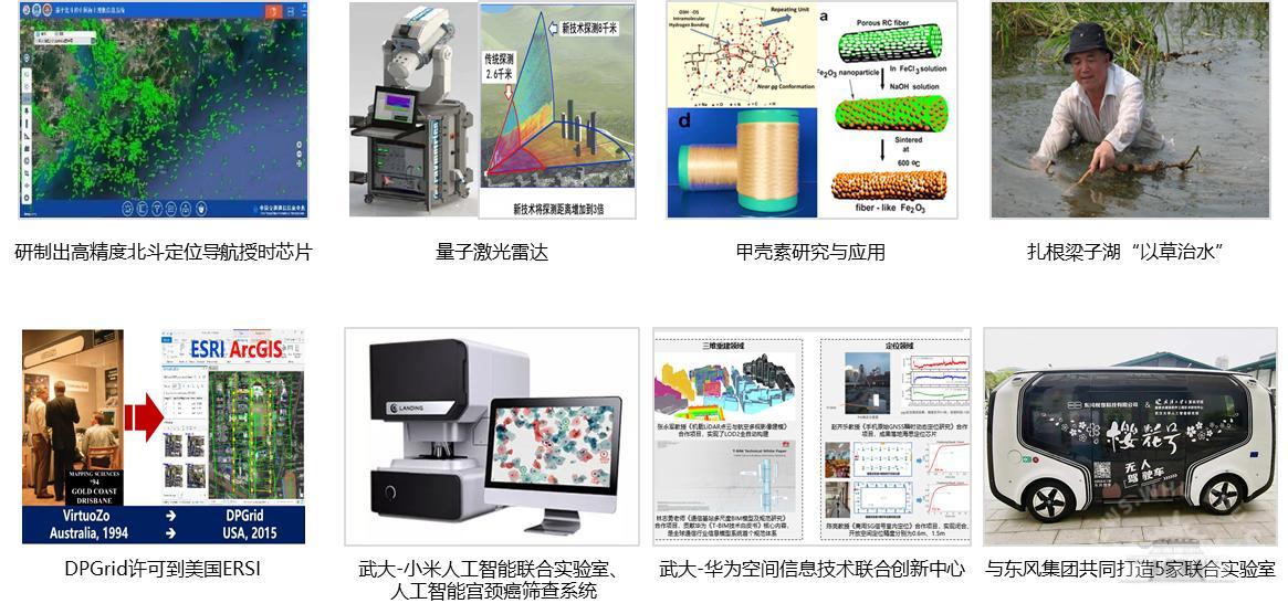 朱英國院士團(tuán)隊(duì)研發(fā)的紅蓮型雜交水稻在全球累計(jì)推廣過億畝;張祖勛院士團(tuán)隊(duì)研發(fā)的數(shù)字?jǐn)z影測量網(wǎng)格軟件向全球知名的美國esri公司授權(quán)許可,首次實(shí)現(xiàn)了我校千萬級科技成果向發(fā)達(dá)國家轉(zhuǎn)化;于丹教授團(tuán)隊(duì)扎根梁子湖“以草治水”,為長江經(jīng)濟(jì)帶“生態(tài)優(yōu)先,綠色發(fā)展”提供典范,入選首批全國高校黃大年式教師團(tuán)隊(duì);李義天教授團(tuán)隊(duì)“沖積通航河道整治理論和關(guān)鍵技術(shù)”破解了長江中下游2000余公里河道整治與防洪、航運(yùn)及環(huán)境保護(hù)之間的矛盾;史良勝教授團(tuán)隊(duì)研發(fā)的國內(nèi)首個(gè)集農(nóng)田水肥調(diào)控于一體的“農(nóng)業(yè)大腦”系統(tǒng)得到中央政治局委員、國務(wù)院副總理胡春華的肯定;武漢生物技術(shù)研究院、武漢導(dǎo)航工業(yè)研究院等一批新型科技成果轉(zhuǎn)化平臺深度融入創(chuàng)新湖北建設(shè),有力推動(dòng)了生物醫(yī)藥、地球空間信息等新技術(shù)產(chǎn)業(yè)的集群發(fā)展。