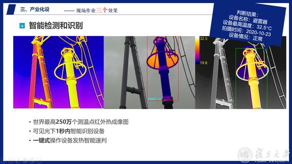 在3i(intelligent智能的,infrared紅外,inspection檢測)紅外智檢成果中,國網(wǎng)上海市電力公司電力科學研究院張勇、顏楠楠項目組團隊與國網(wǎng)電力上海公司合作,基于變電站機器人巡檢的紅外熱成像圖譜分析,研發(fā)智能電網(wǎng)關(guān)鍵設備狀態(tài)的自動評估方案。研制世界首臺電力紅外視覺智能檢測裝置,可智能識別設備、引導拍攝、優(yōu)化圖像質(zhì)量、快速智能診斷、一鍵生成報告。2021年,該裝置在上海公司1000kv特高壓練塘變電站、±500kv華新直流換流站等多個站內(nèi)一次設備日常運維中,圖譜有效識別準確率98%,全過程紅外診斷耗時減少約70%,整體工作效率提高3倍以上。