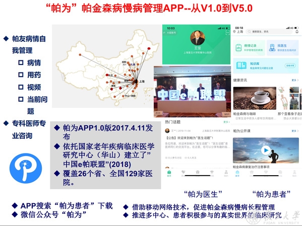針對帕為app及在線智能評估,華山醫(yī)院神經(jīng)內(nèi)科教授王堅團隊研發(fā)了帕為帕金森病app慢病管理平臺,依托于華山醫(yī)院國家老年疾病臨床醫(yī)學研究中心建立了“中國e帕聯(lián)盟”,是目前國內(nèi)唯一一個集帕金森病慢病app管理和真實世界臨床研究為一體的移動網(wǎng)絡平臺,自從2017年4月上線至今,每年更新改版一次,app功能逐步增加了患教資訊、醫(yī)患互動咨詢、語音定量分析、運動視頻捕捉定量分析、帕友論壇等功能模塊,用戶數(shù)和粘度都有顯著提升。目前覆蓋全國26個省、130余家醫(yī)院,1.8萬多名注冊使用者,共60萬+次健康宣教視頻/音頻/文章閱讀,9700+段上傳的運動測試動作視頻,6400+段語音測試音頻,1.4萬多次咨詢。