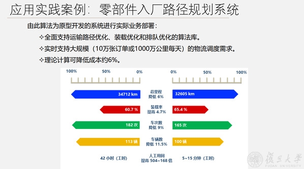 關(guān)于混合車輛線路規(guī)劃系統(tǒng),復旦大學數(shù)學科學學院教授盧文聯(lián)介紹,團隊自主開發(fā)全針對零售/快運/配送物流與制造業(yè)供應鏈管理中的運輸、倉儲、調(diào)度、劃撥、網(wǎng)絡、售后等的預測、規(guī)劃、決策與數(shù)據(jù)挖掘的智能算法定制系統(tǒng)?;谠撍惴ㄏ到y(tǒng),與上汽人工智能實驗室合作開發(fā)的物流調(diào)度優(yōu)化系統(tǒng)已應用到上汽安吉物流的供應鏈業(yè)務中,實際零部件進場業(yè)務測試中,相比原有人工調(diào)度,總里程下降6%,裝載率提高4.7%, 車輛數(shù)目下降11.5%,調(diào)度時間提升高至500倍。團隊也與上海富勒科技信息有限公司等單位開展物流與規(guī)劃的合作應用,取得較好效果。