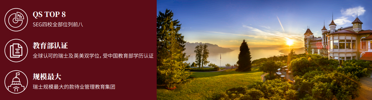 seg是瑞士規(guī)模最大的款待業(yè)管理教育集團(tuán),旗下?lián)碛腥蚩畲龢I(yè)管理專(zhuān)業(yè)前十的四所頂尖大學(xué),五大校區(qū),有超過(guò)6000名學(xué)生報(bào)名這四所學(xué)校的課程。四校課程側(cè)重點(diǎn)各有不同,但都擁有多樣化的國(guó)際經(jīng)驗(yàn)、本科及碩士課程,并提供不同崗位的全球帶薪實(shí)習(xí)機(jī)會(huì),學(xué)生可以從中獲取寶貴的工作經(jīng)驗(yàn)。