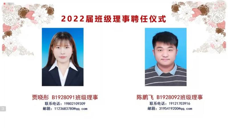 班級(jí)理事聘任儀式上,學(xué)院正式聘任賈曉彤為2022屆b1928091班理事,陳鵬飛為b1928092班理事。在未來(lái),期望兩位理事能夠切實(shí)成為學(xué)院和校友之間的溝通橋梁,延續(xù)溫暖有愛(ài)班集體的優(yōu)良傳統(tǒng)。