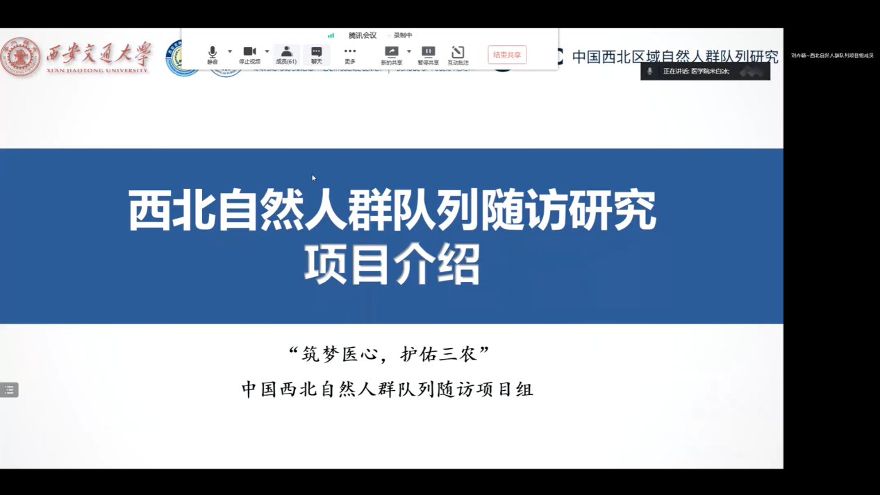 米白冰對(duì)西北自然人群隊(duì)列隨訪研究項(xiàng)目進(jìn)行介紹。本次實(shí)踐活動(dòng)擬采用電話、實(shí)地入戶調(diào)研等多種形式,開展針對(duì)西北自然人群隊(duì)列陜西研究現(xiàn)場4萬8千余名完成基線調(diào)查的研究對(duì)象的隨訪工作,了解其健康狀態(tài)變化及相關(guān)影響因素。米白冰對(duì)西北自然人群隊(duì)列研究項(xiàng)目,從建立覆蓋西北區(qū)域多民族自然人群隊(duì)列的迫切性與必要性切入,對(duì)項(xiàng)目整體研究設(shè)計(jì)、項(xiàng)目負(fù)責(zé)人、已有工作成果、調(diào)查員要求和相關(guān)福利、隨訪階段急需解決的問題與后續(xù)工作計(jì)劃等五個(gè)方面分別進(jìn)行了詳細(xì)介紹。米白冰圍繞此次暑期實(shí)踐安排,著重介紹了活動(dòng)安排與活動(dòng)內(nèi)容,同時(shí)對(duì)暑期主要工作-電話隨訪的工作流程進(jìn)行了演示。米白冰對(duì)參與本次暑期社會(huì)實(shí)踐活動(dòng)提出了殷切期望,并鼓勵(lì)同學(xué)們積極參與實(shí)踐項(xiàng)目,投身人民健康事業(yè)。