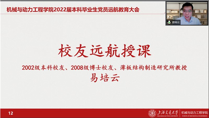 6月18日,機(jī)械與動(dòng)力工程學(xué)院“思源致遠(yuǎn),揚(yáng)帆遠(yuǎn)航”2022屆本科生畢業(yè)生黨員遠(yuǎn)航教育大會(huì)在線上隆重舉行。機(jī)械與動(dòng)力工程學(xué)院黨委書記林立濤,黨委副書記張執(zhí)南,2002級(jí)本科校友、2008級(jí)博士校友、薄板結(jié)構(gòu)制造研究所教授易培云,思政教師、輔導(dǎo)員以及2022屆本科生畢業(yè)生黨員出席會(huì)議。會(huì)議由學(xué)院本科生黨建工作負(fù)責(zé)人蘇友煌主持。