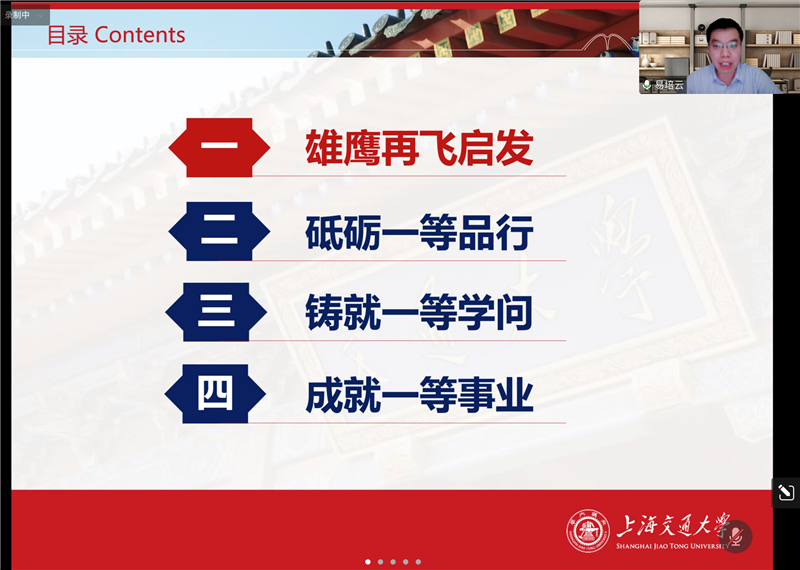 易培云結(jié)合自身經(jīng)歷,以“顛覆過去,重新出發(fā)”為主題,與畢業(yè)生黨員分享了自己的感悟。他通過講述雄鷹斷喙拔羽重獲新生的故事,希望畢業(yè)生黨員勇于自我革新,在人生新起點(diǎn)重新出發(fā),樹立更高的人生目標(biāo)和理想,實(shí)現(xiàn)人生價(jià)值。他講述自己與交大的情緣,通過分享自己在交大學(xué)習(xí)、科研、教書育人過程中的故事,啟迪同學(xué)們:唯有心存感恩,才能謙卑于外,砥礪一等品行;唯有艱苦奮斗,才能學(xué)有所成,砥礪一等學(xué)問;唯有勇于創(chuàng)新,才能激發(fā)潛能,砥礪一等事業(yè)。他還從科學(xué)選題、合理寫作、巧用工具等方面與同學(xué)們分享了學(xué)術(shù)論文寫作的技巧。最后他用“做人要知足,做事要知不足,做學(xué)問要不知足。”勉勵(lì)畢業(yè)生黨員堅(jiān)持夢(mèng)想,腳踏實(shí)地,為國家社會(huì)和人類發(fā)展進(jìn)步作出貢獻(xiàn)。