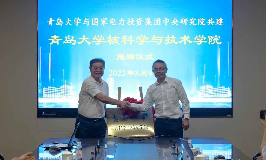 新聞網(wǎng)訊8月9日,我校與國家電力投資集團(tuán)中央研究院共建核科學(xué)與技術(shù)學(xué)院揭牌儀式在會(huì)議中心致遠(yuǎn)廳舉行。國家電投集團(tuán)中央研究院黨委書記、董事長范霽紅,校長夏東偉出席會(huì)議并講話。會(huì)議由校黨委常委、副校長于永明主持。儀式上,范霽紅與夏東偉共同為青島大學(xué)核科學(xué)與技術(shù)學(xué)院揭牌。