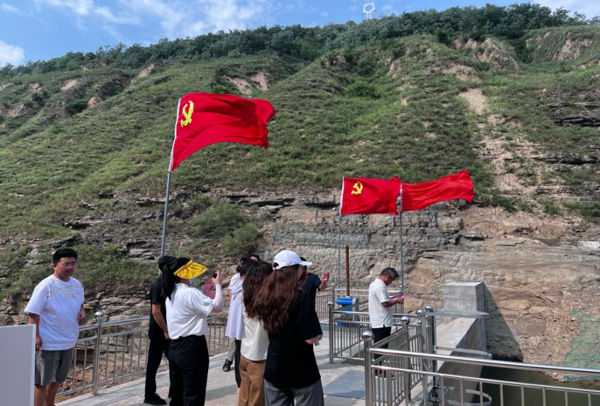 在延安市宜川縣閣樓片區(qū)抗旱保供井家溝蓄水壩工程現(xiàn)場,團隊成員了解到在脫貧攻堅期間,宜川縣的農村人飲問題得到了有力解決,但黃河沿岸年均降雨量較低,生產用水極度缺乏,導致蘋果產業(yè)效益低下,群眾收入水平不高。為落實黃河流域生態(tài)保護和高質量發(fā)展“四水四定”原則,著力破解黃河沿岸產業(yè)用水抗旱保供問題,宜川縣開啟建設井家溝蓄水壩工程。工程建成后,可解決閣樓片區(qū)10個村、5300 畝果園灌溉用水以及722戶、2442人的飲水問題。下午,團隊赴壺口瀑布國家地質公園進行參觀學習,成員們共同觀看了黃河流域紀錄片,了解學習到“母親河”的歷史起源、發(fā)展歷程與未來建設。