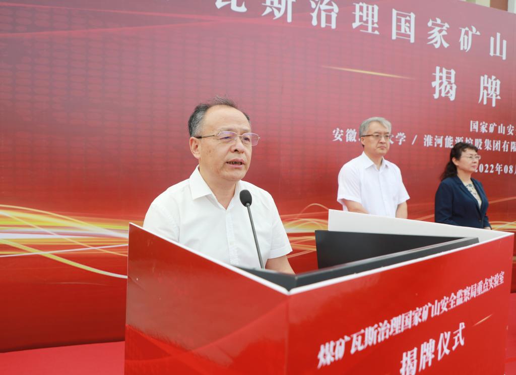 國家礦山安全監(jiān)察局黨組成員、副局長周德昶,國家礦山安全監(jiān)察局監(jiān)察專員王素鋒,國家礦山安全監(jiān)察局法規(guī)科技司二級巡視員王鐵根,國家礦山安全監(jiān)察局安徽局黨組書記、局長許勝銘,安標國家中心黨總支書記、執(zhí)行董事朱鳳山,安徽省能源局煤礦安全監(jiān)管處處長方恒林,淮河能源集團副總經(jīng)理牛多龍,校黨委書記郭永存,黨委副書記、校長袁亮院士,黨委常委、副校長鄭明東等出席揭牌儀式。揭牌儀式由王鐵根主持。