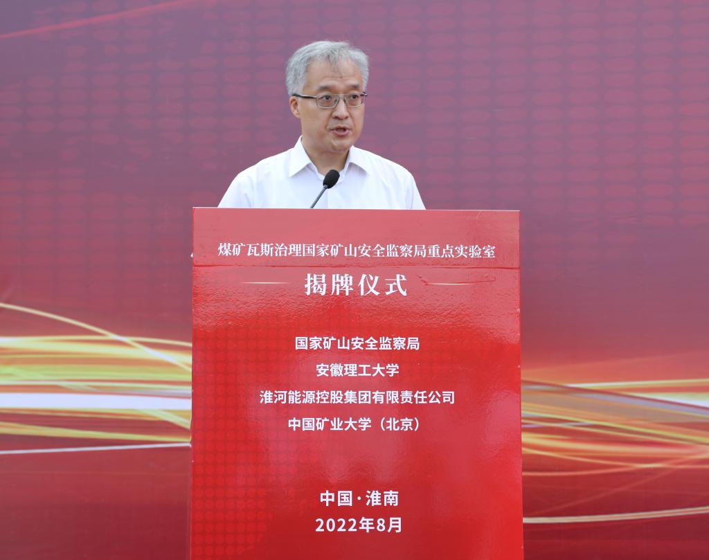 郭永存代表學(xué)校向國家礦山安監(jiān)局對學(xué)校的關(guān)心和支持表示衷心感謝,向出席儀式的各位嘉賓致以誠摯歡迎!郭永存全面回顧了學(xué)校歷史及近年來學(xué)校各項事業(yè)發(fā)生的深層次、格局性變化。他表示,重點實驗室的揭牌,標志著我校在助力國家礦山安全科技創(chuàng)新、服務(wù)行業(yè)高質(zhì)量發(fā)展上邁上新臺階。煤炭工業(yè)是關(guān)系國家經(jīng)濟命脈和能源安全的重要基礎(chǔ)產(chǎn)業(yè)。隨著煤炭開采的深度逐年增加,煤炭開采面臨的動力災(zāi)害必將更加嚴峻復(fù)雜,重點實驗室著眼煤與瓦斯共采、瓦斯動力災(zāi)害致災(zāi)、多災(zāi)耦合及演化等研究方向,做好“政產(chǎn)學(xué)研用”協(xié)同創(chuàng)新、聯(lián)合攻關(guān),必將突破一批關(guān)鍵共性技術(shù)難題,形成一批助推礦山安全高質(zhì)量發(fā)展的核心技術(shù),推動一批科技創(chuàng)新成果轉(zhuǎn)移轉(zhuǎn)化落地見效。郭永存表示,學(xué)校將統(tǒng)籌優(yōu)勢力量,努力將實驗室建設(shè)好、運行好、管理好,力爭打造國家礦山安全領(lǐng)域標桿重點實驗室,為煤炭行業(yè)安全生產(chǎn)提供有力的科技和智力支撐。