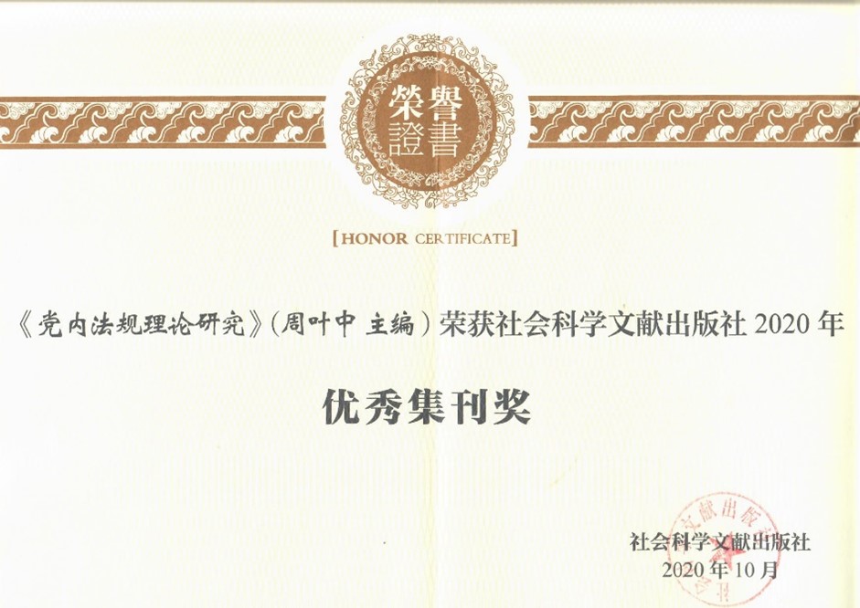 建設理論研究陣地。中心始終著力打造理論研究陣地,為引領黨內(nèi)法規(guī)理論研究提供平臺支撐。2018年,中心創(chuàng)辦國內(nèi)第一本黨內(nèi)法規(guī)專業(yè)類學術集刊《黨內(nèi)法規(guī)理論研究》,并于當年出版創(chuàng)刊號,在全國黨內(nèi)法規(guī)理論界和實務界產(chǎn)生重大影響。2020年,刊物榮獲社科文獻出版社“2020年度全國優(yōu)秀學術集刊獎”。2021年,集刊“紀念中國共產(chǎn)黨成立100周年特輯”出版,并與知網(wǎng)達成戰(zhàn)略合作協(xié)議,進一步促進了中心優(yōu)秀成果的傳播與推廣。2022年,根據(jù)國家新聞出版署批復,由教育部主管、武漢大學主辦、武漢大學出版社有限責任公司出版的期刊《黨內(nèi)法規(guī)研究》正式獲批創(chuàng)刊(刊號:cn42-1925/d)。該刊為黨內(nèi)法規(guī)領域第一本公開發(fā)行的學術期刊。