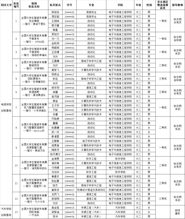 在學(xué)校本科生院的支持下,同濟(jì)大學(xué)全國大學(xué)生智能車競賽實驗室選拔各專業(yè)本科生組建隊伍,參賽隊員來自電子與信息工程學(xué)院、汽車學(xué)院、軟件學(xué)院和機(jī)械與能源工程學(xué)院,涵蓋自動化、計算機(jī)科學(xué)與技術(shù)、電子科學(xué)與技術(shù)、通信工程、微電子科學(xué)與工程、信息安全、車輛工程、軟件工程、機(jī)械設(shè)計制造及其自動化等專業(yè)。經(jīng)過緊張備戰(zhàn),同學(xué)們在電子與信息工程學(xué)院張志明、朱勁和汽車學(xué)院田煒老師的帶領(lǐng)下,參加了大賽競速賽七個組別和綜合賽百度組別,并在比賽中有所斬獲。其中,電子與信息工程學(xué)院8支參賽隊伍共獲得競速賽華東賽區(qū)一等獎3項、二等獎1項和三等獎2項,以及百度智慧交通組東部賽區(qū)一等獎1項和二等獎1項。我校5支隊伍獲得晉級全國總決賽資格,入圍總決賽隊伍數(shù)量為我校歷屆參賽最多的一次。