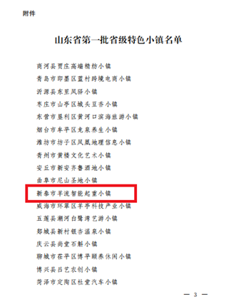 2021年2月1日山東省人民政府印發(fā)《關(guān)于命名第一批省級(jí)特色小鎮(zhèn)和取消部分特色小鎮(zhèn)創(chuàng)建資格的通知》,確定命名商河縣賈莊高端精紡小鎮(zhèn)等18個(gè)小鎮(zhèn)為第一批省級(jí)特色小鎮(zhèn),新泰市羊流智能起重小鎮(zhèn)被列為山東省第一批省級(jí)特色小鎮(zhèn)。