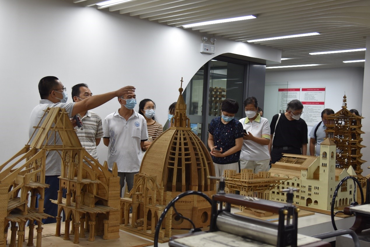 在建筑與城市規(guī)劃學(xué)院d樓一樓,馬克思主義學(xué)院教師參觀了“建筑與城市規(guī)劃學(xué)院教學(xué)創(chuàng)新基地”。該基地是安排學(xué)生進(jìn)行專業(yè)實踐課程的重要教學(xué)場所,也是學(xué)生設(shè)計作品交流和展示的重要平臺。自由的教學(xué)空間與模型制作空間為學(xué)生提供了極富創(chuàng)意的空間場所,形成了富有特色的實踐教學(xué)模式。在該基地的展廊中陳列著以“建黨百年”“抗疫”“鄉(xiāng)村振興與城市發(fā)展”為主題的學(xué)生作品。琉璃、磚雕、木雕、陶藝、剪紙等各式作品,展現(xiàn)出學(xué)生兼具設(shè)計稟賦與家國情懷的創(chuàng)意理念。