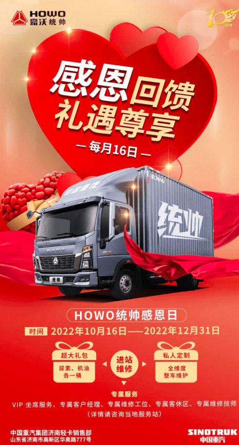 驚喜不止一面,中國重汽howo輕卡推出統(tǒng)帥專屬vip服務(wù)的同時(shí),還專門將每月16日定為統(tǒng)帥感恩日,為客戶送上感恩大禮包。