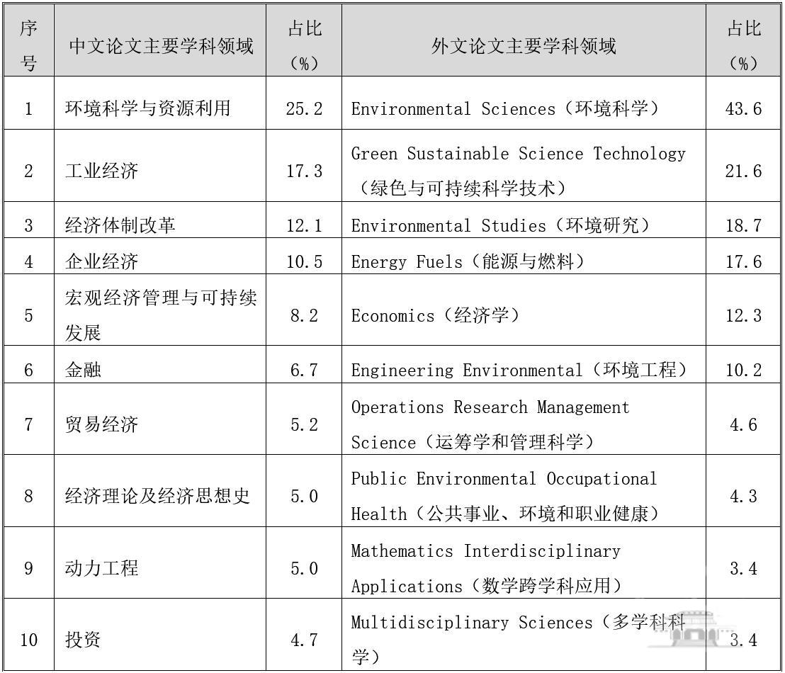 中外文數(shù)據(jù)庫學科分類統(tǒng)計結果顯示:環(huán)境科學仍然是碳中和領域國家社科基金科研成果涉及的首要的學科領域,中文部分占比四分之一,外文部分占比將近一半;除環(huán)境科學外,中文論文主要集中于經(jīng)濟學和管理學,而外文論文則涉及能源、經(jīng)濟、管理、數(shù)學等跨學科多學科領域,發(fā)文聚焦的前10個學科領域詳見表4。